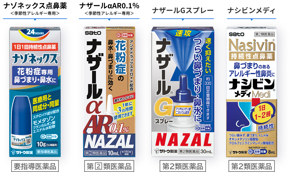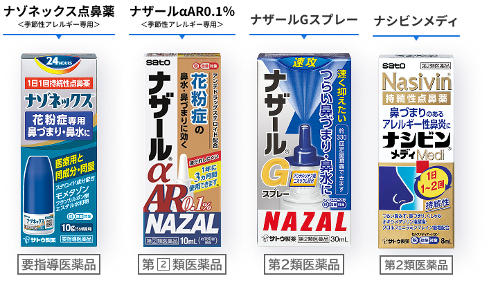 サトウ製薬には症状や目的に合わせて選べる、4種類10製品もの点鼻薬があります。